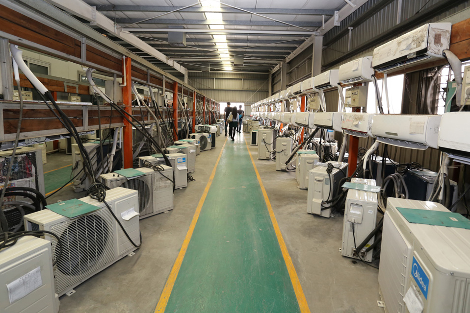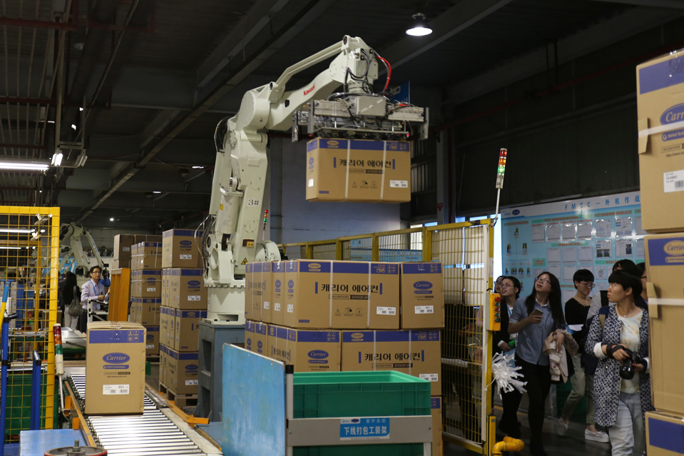 現(xiàn)在的空調(diào)生產(chǎn)線,出現(xiàn)的已不再是擁擠忙碌得跟陀螺似的產(chǎn)業(yè)工人。因?yàn)椴簧俚?span lang="EN-US">“機(jī)器手”、“機(jī)器人”的出現(xiàn),勞動(dòng)密集型的家電制造工廠被賦予了全新的“科技感”和“智能化”的色彩。在空調(diào)室內(nèi)、外機(jī)總裝線體的末端,裝箱、打包等繁重環(huán)節(jié),早已被機(jī)器人所取代。當(dāng)成品從生產(chǎn)線上完成之后,也是通過機(jī)器手直接搬運(yùn)到流轉(zhuǎn)板上。